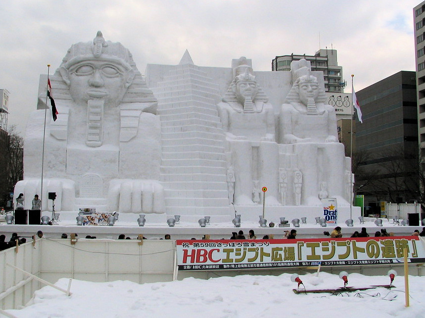 大通7丁目はエジプトの遺跡。この7丁目のHBC広場はいつも外国の著名な建造物を大雪像としているんですが、今年はHBC開局50周年記念で道立近代美術館で開催中の「吉村作治の早大エジプト発掘40年展」とタイアップしてか、ピラミッドにスフィンクス、アブ・シンベル神殿のラムセス2世座像の雪像です。昨年と同じく階段付きの台を設置して撮影スポットとして、スタッフの人が写真を撮ってくれました。せっかくの記念なので今年も写真を買ってきましたが、まあ別に買う買わないは個人の自由ですからね。