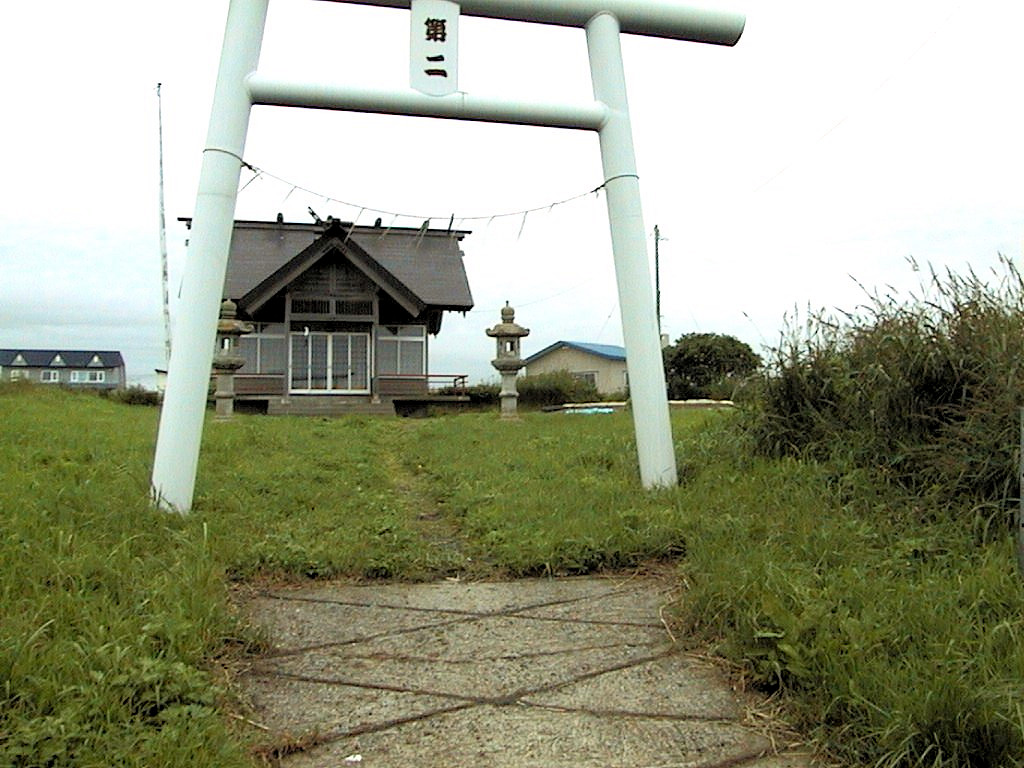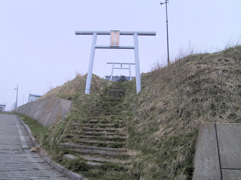 桂恋チャシはサンケオマナイ川の河口へ向けて南東方向へ舌状に張り出した台地の北西部を一条の壕で断ち切って構築されていました。ですが、そのの主体部は古くから観音堂が建てられ、現在は桂恋神社となり、一条あった堀もなくなりチャシとしての面影はありません。壕が位置した北西側台地も昭和43年昆布干場として造成され原形を失っています。(1999/7/29)