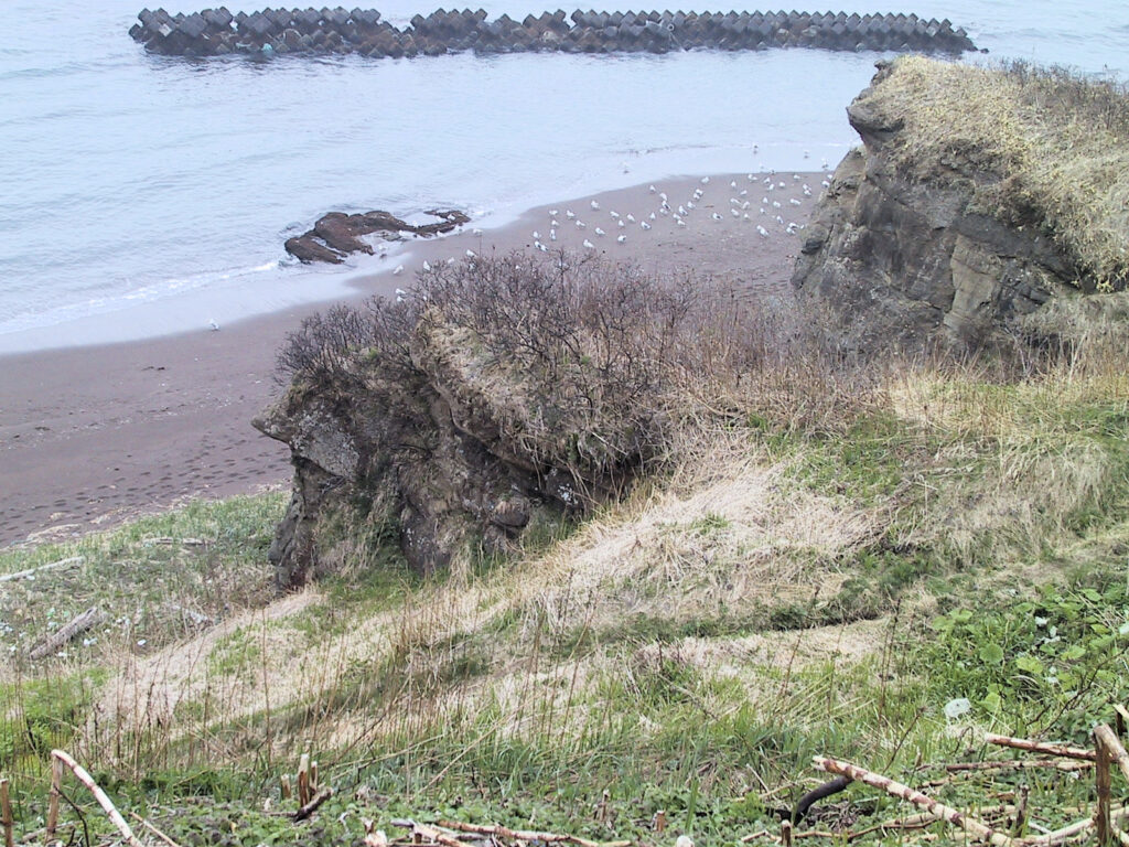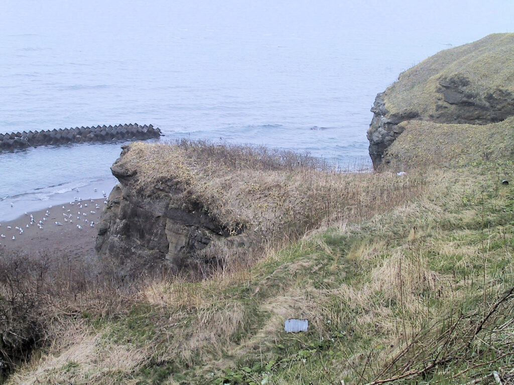 桂恋方形チャシは海に突き出た台地上に幅4m、深さ1.5mのコの字状の壕をめぐらしたのが特色とされていますが、それらしいところを見つけたものの、壕は確認できませんでした。(1999/7/29)