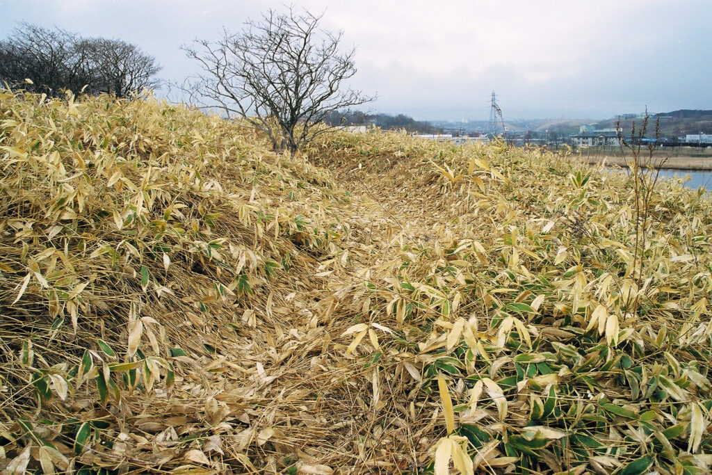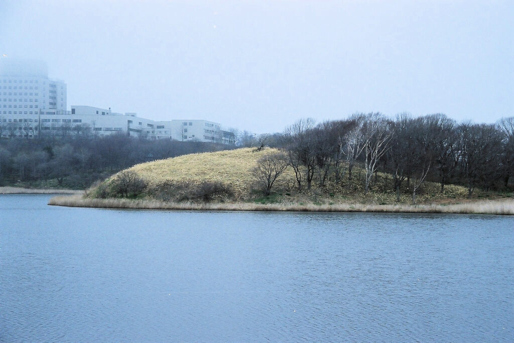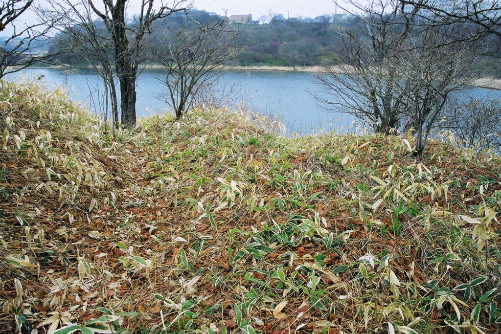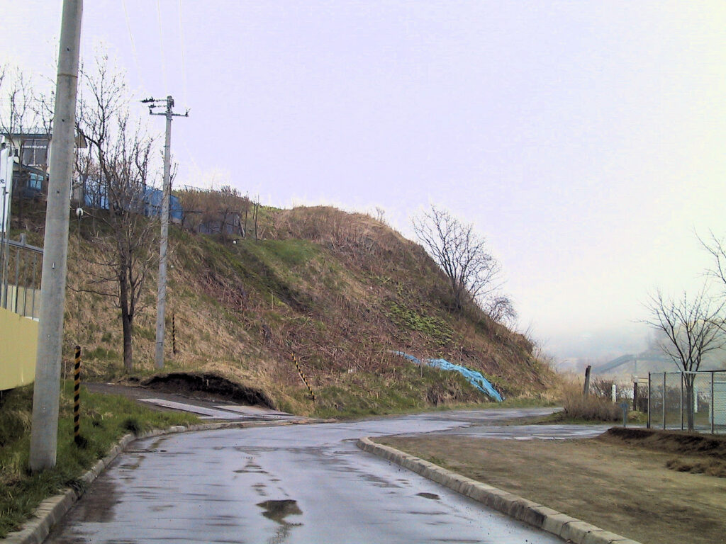 モシリヤチャシの次は、前回と同じく鶴ヶ岱チャランケチャシです。前回は夏の最中で草が生い茂り、壕の形状をほとんど確認できませんでしたが、今回はバッチリ! 丸く囲むような周壕が2本はっきりと確認できました。とはいうものの、写真にするとちょっとわかりにくいですけどね(^^;) (2002/5/4)