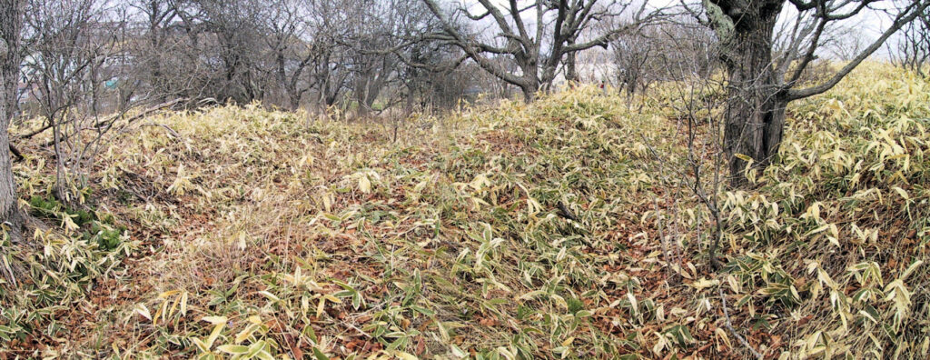遺構は東西に伸びる二条の空壕がありますが、草でやや見にくくなっています。『日本城郭体系』では湖に面する南側の壕は埋没しているということですので、本来は二本の円形の壕がこの台地頂部を囲む丘頂式のチャシだったのかもしれません。チャシ全体を見渡すのでしたら、チャシの東側にある春採アイスアリーナの方から眺めるか、春採公園の青少年科学館裏の岬から眺めると良いでしょう。
