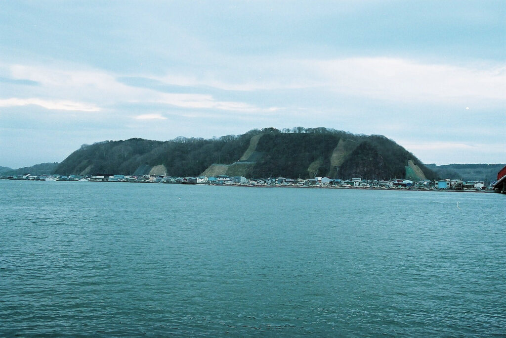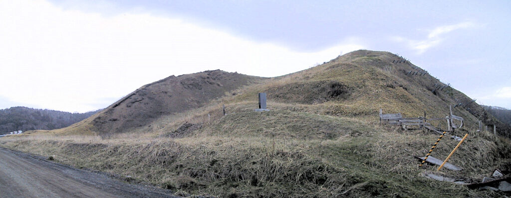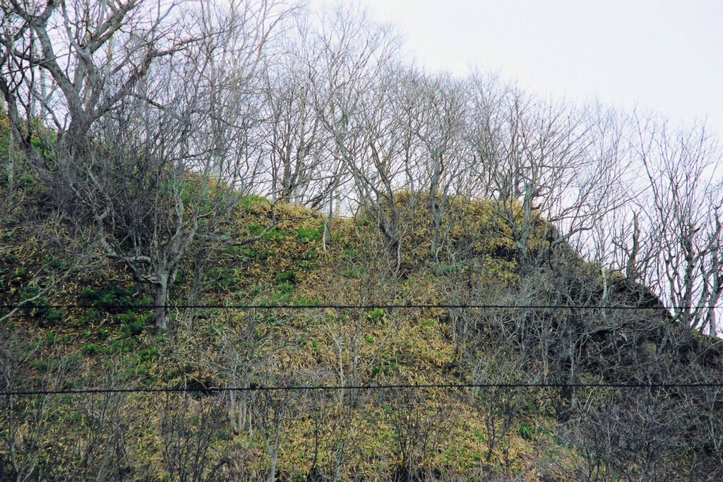 特に説明板はありませんでしたが、漁港近くの山のてっぺんが御供山型をしていましたので、たぶんあれがそうでしょう。麓の方に「アイヌ一族之供養塔」もありました。
