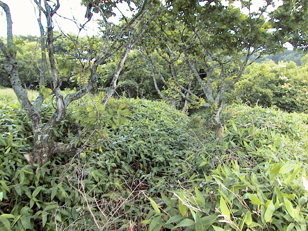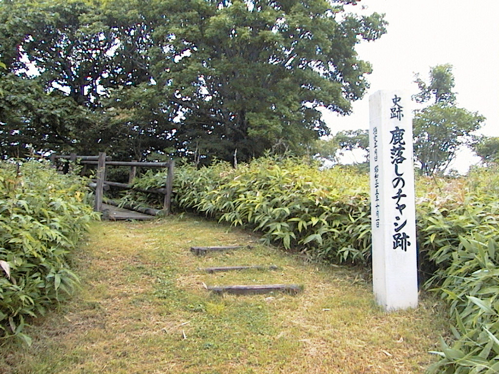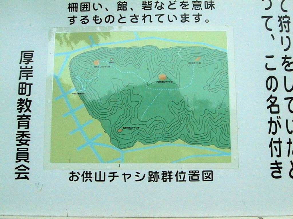 このチャシを含めた御供山チャシ群は、比較的よく整備されていると思います。途中にあったパークゴルフ場は草が伸び放題になっていましたが、3つのチャシへと続く遊歩道は草が刈ってありましたし、きちんと説明版もありますので見つけやすいです。チャシの主体部や壕の草も刈ってくれると、チャシの形がよくわかるのですが、それをいうのはぜいたくというものでしょうね。いままで行ったチャシの中でそんな風にきちんと整備されていた所ってホント少ないですから、まだこれらのチャシは大事にされているなあと思いました。(1999/7/29)