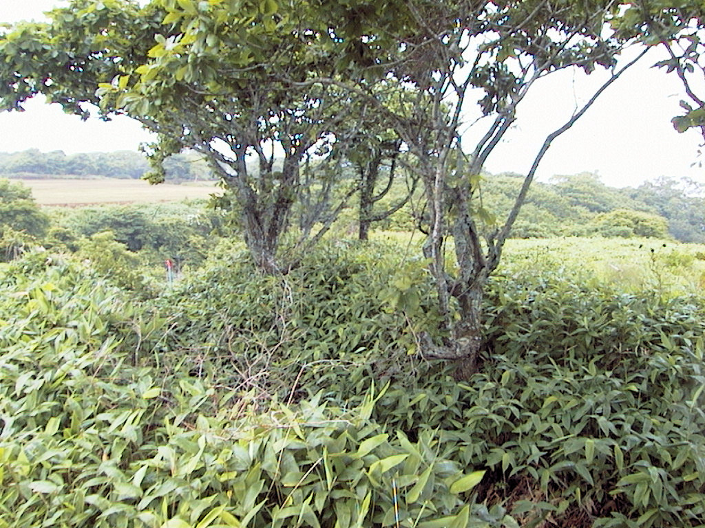 奔渡裏山チャシからさらに数百m進むと左側に逆水松チャシがあります。このチャシも厚岸湖に面していますが、チャシ主体部は草で埋まっていて湖は見ることができませんでした。チャシの南側に逆水松の木があり、その周囲だけは草が刈ってありました。この逆水松(さかさおんこ)の木は町指定天然記念物に指定されているそうです。
