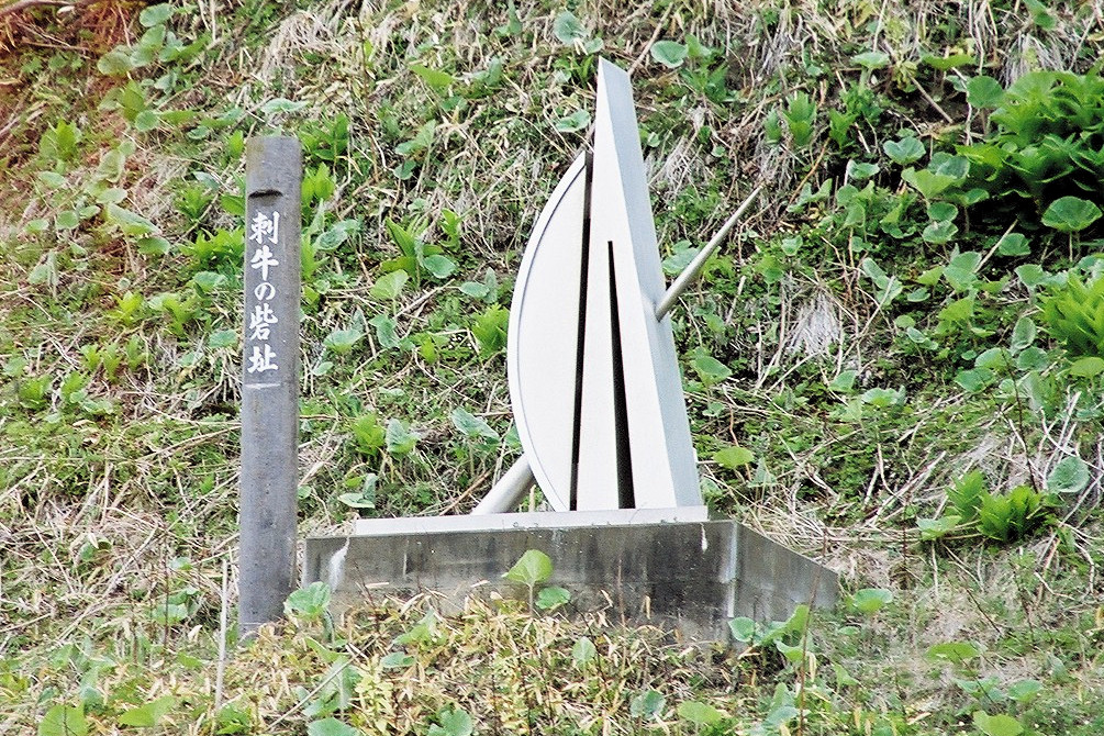 どのあたりかなと車で走りながら探していたら、途中で左側の崖の途中に何か記念碑のようなものを発見しました。ちょっと変わった形をした記念碑なので、すぐ目に付くと思います。「刺牛の砦址」と書いてありましたので、ここがサシウシチャシの場所だとわかりましたが、急な崖の途中にあり、登るどころか下から眺めることしかできませんでした。