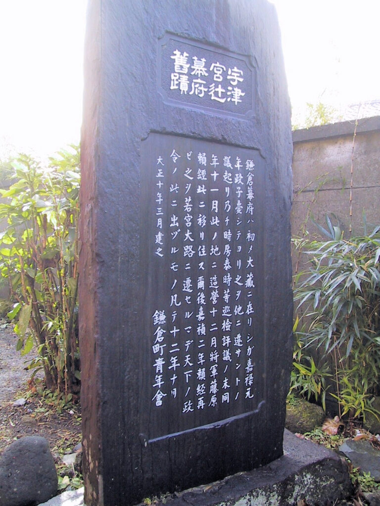 旅行3日目、この日は鎌倉へと行きました。JR鎌倉駅で降りると、まず駅横のレンタサイクルで自転車を借り、鶴岡八幡宮方面へと向かいました。『神奈川県の歴史散歩』を見ると、途中の脇道に幕府跡の史跡が載っていたので、途中から小道には入り、まず最初に宇都宮辻子幕府跡の石碑を見つけました。ここは宇都宮稲荷という小さな社があり、4代将軍藤原頼経が執権北条泰時らとともに、幕府を源頼朝以来の大蔵から鎌倉の中心部に移して、嘉禄元年(1225)から嘉禎2年(1236)まで政治を見たところです。(今はこの石碑以外何もありませんが)