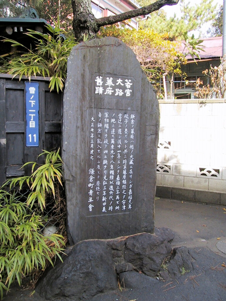 そこからまたしばらく北に進むと鶴岡八幡宮の前に出たのですが、自転車を置く場所が見つけられなかったので、鶴岡八幡宮はあとにして、その東側にあるという源頼朝の墓の方へ進みました。すると途中で大倉幕府跡の石碑を見つけました。ここは治承4年(1180)源頼朝が鎌倉に入ってつくった邸で、やがて最初の幕府が置かれた場所です。源氏三代の幕政の中心地でしたが、嘉禄元年(1225)執権北条泰時は宇都宮辻子に幕府を移しました。