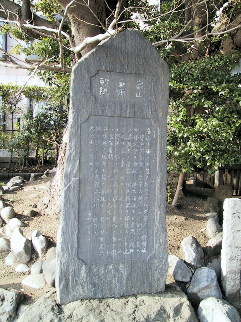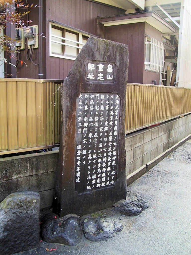 源頼朝の墓にお参りしましたあとは西の方に戻り、途中に自転車をちょっと置いて鶴岡八幡宮の方へ向かいましたが、そのすぐ近くに、鎌倉幕府の有力御家人である畠山重忠邸跡の石碑を見つけました。