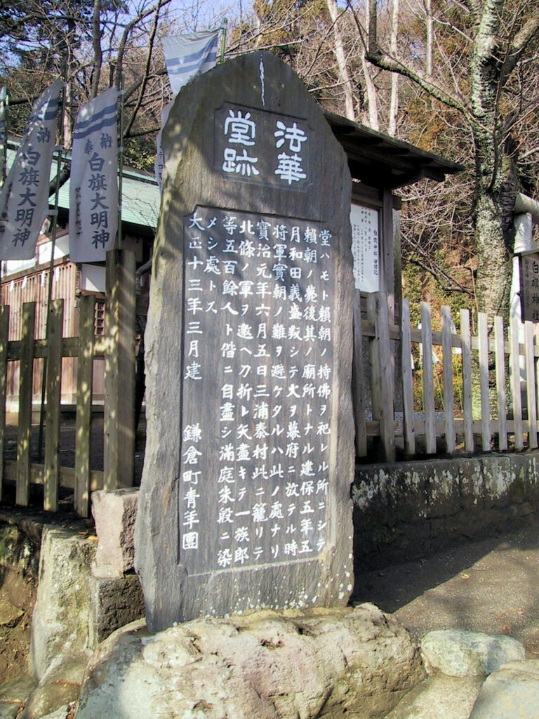 大蔵(大倉)幕府跡の石碑から北に進むと白旗神社が見えてきます。ここは法華堂跡で、もとは頼朝の持仏を祀る場所でしたが、その死後は廟所となり大蔵幕府を見下ろす大倉山の中腹に源頼朝は葬られました。