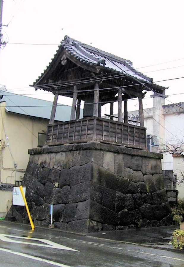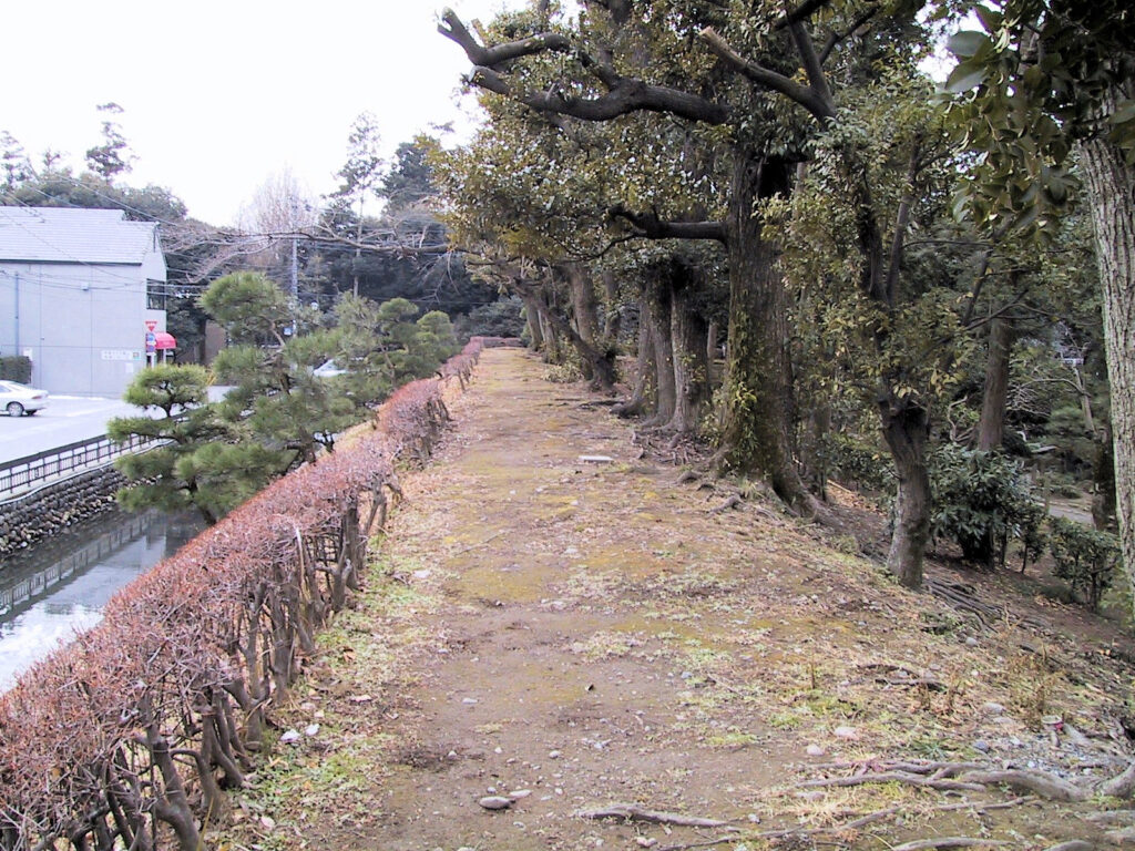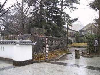 その後はまっすぐ道なりに進み、『神奈川県の歴史散歩』を見ながら幸田門跡を探しました。立派な石碑がありましたが、その奥に三の丸土塁がきれいに残っていました。そのまま進むと、今度は右手に二の丸堀が見え、二の丸隅櫓も見えました。その辺りで左に曲がると市民会館の裏あたりに鐘つき堂が見えました。この辺りがかつての大手門のあったところで、立派な石垣が残っていました。 再びさっきの道へ戻り、二の丸堀に沿って右に曲がると、左側に和風建築の三の丸小学校がありす。ここは江戸後期に集成館という学校があったところでその先を左に曲がったところが箱根口門跡で、ここにはきれいに石垣が残っていました。