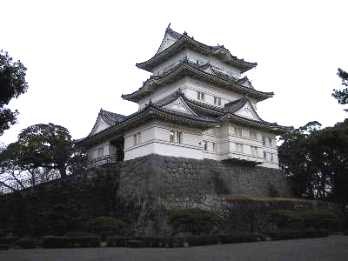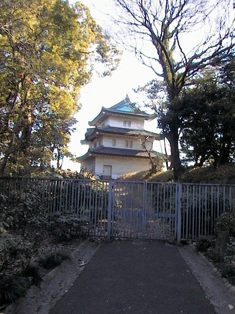 この江戸城は1999年の1月に東京へ旅行したときに、NIFTY-SERVEの城郭フォーラム(FSIRO)のみなさんと訪城しました。まずは和田倉橋を渡り、桔梗門を横目で見ながら大手門の方へ... そして百人番所の前を通って本丸の方へ。この途中で富士見櫓を裏側から見ることができました。この時点ですでに、石垣の多さ、そしてその石の大きさに圧倒されました。そして松の廊下跡や富士見多聞を眺めながら天守台の方へ。この天守台は明暦の大火の後、加賀前田家が再建したのに結局天守は再建されなかったそうですが、何とも残念なことでした。