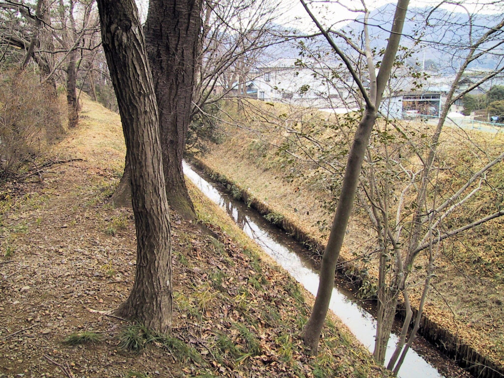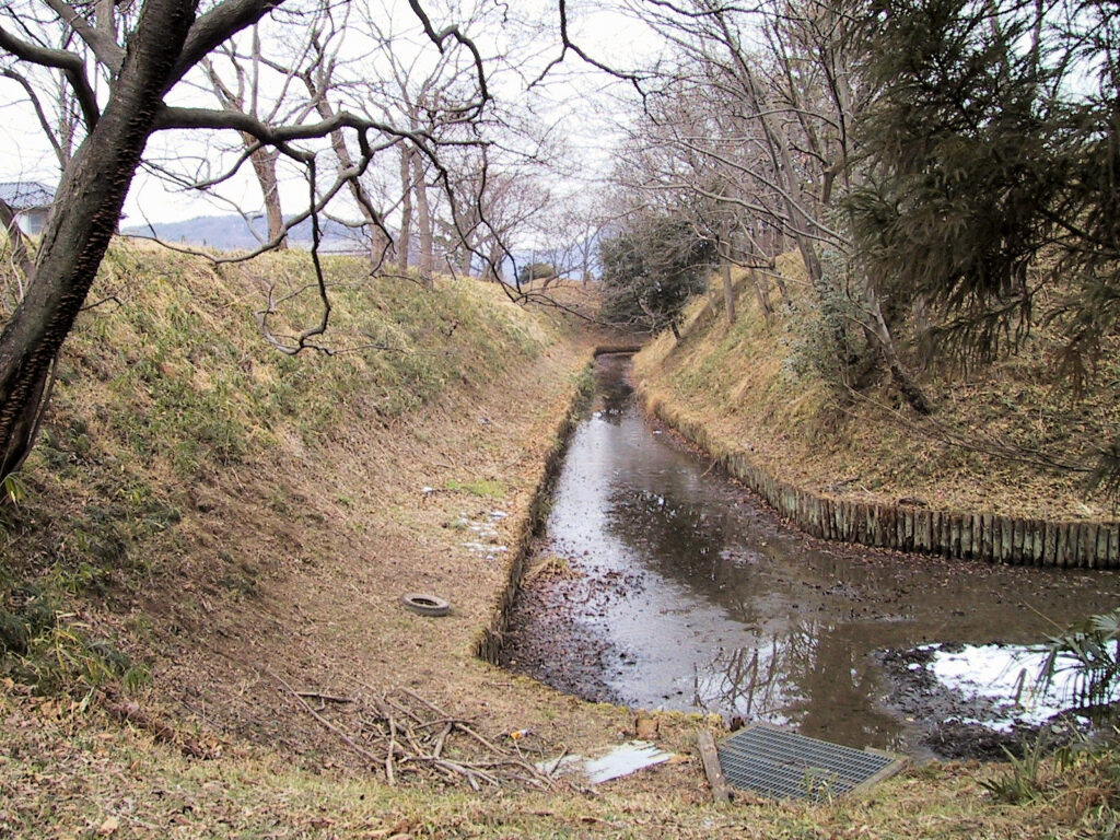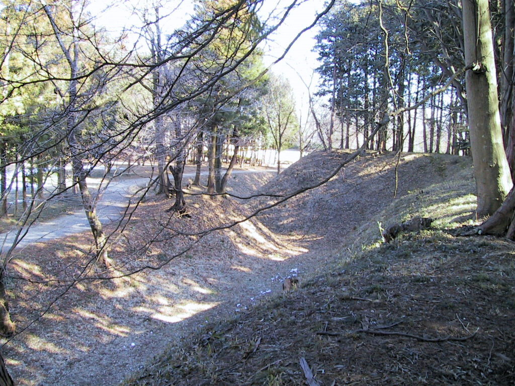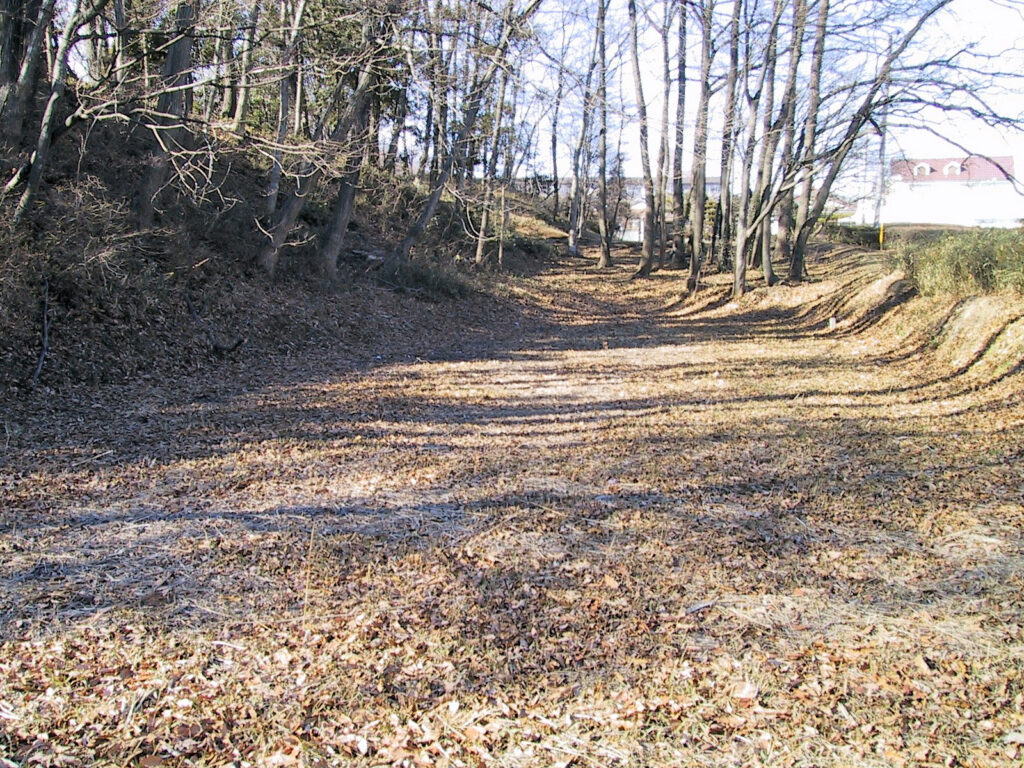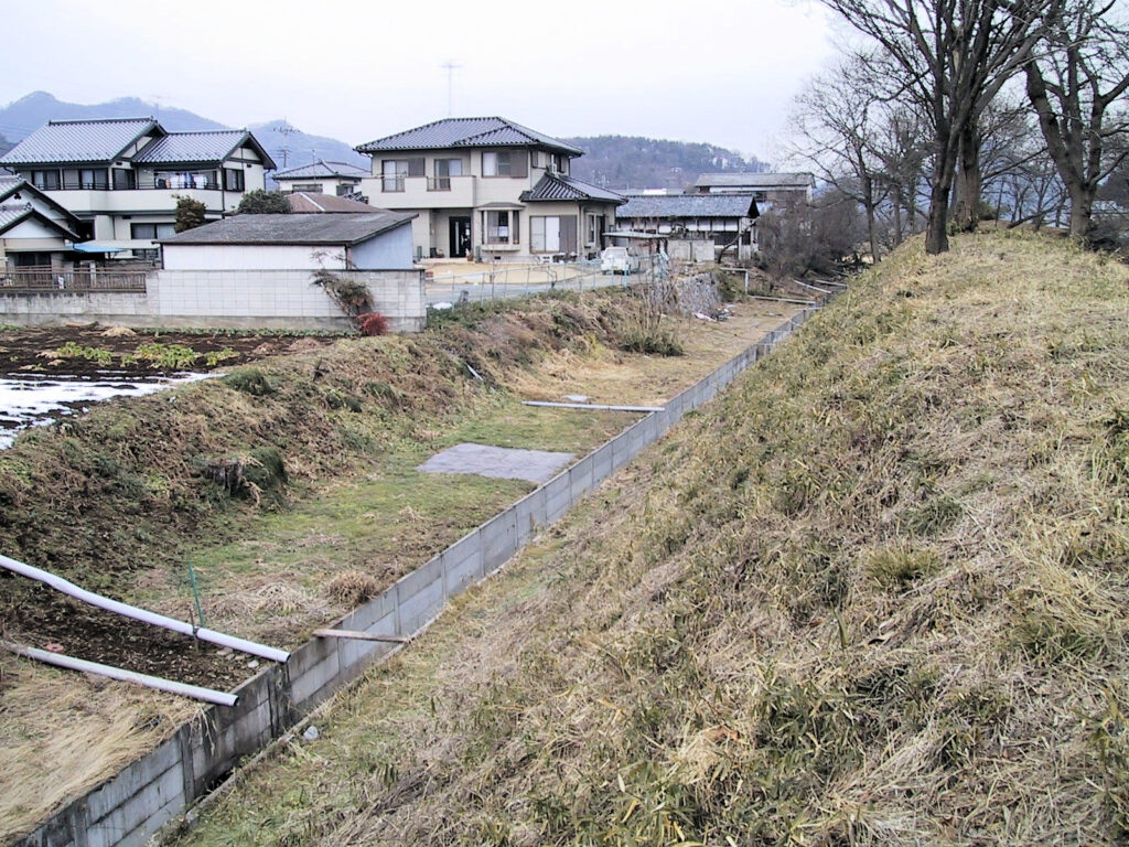 本丸の西側には堀も残っていて、その堀のさらに外側には二の丸の土塁が残っているので二重土塁のようです。この土塁の外側にも堀の跡がありますが、その並びが住宅地になっていますので一見堀跡とは気づかないかもしれませんね。