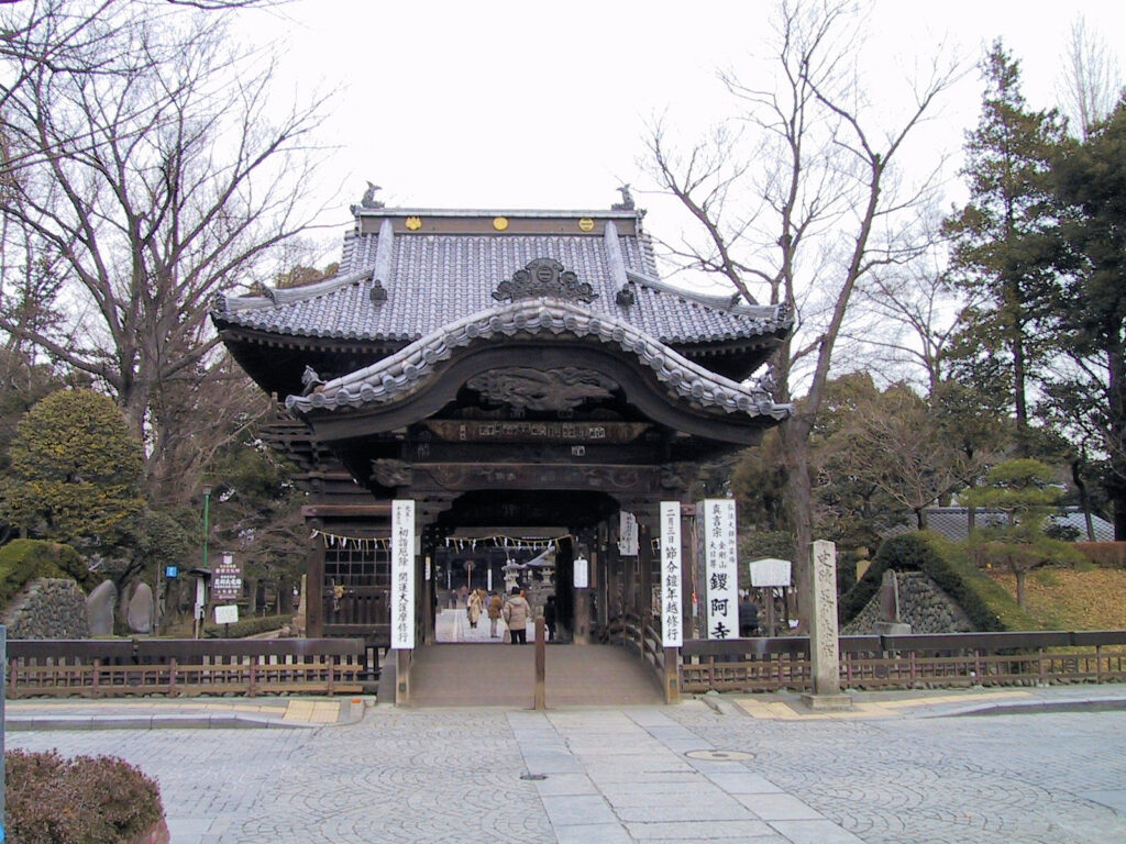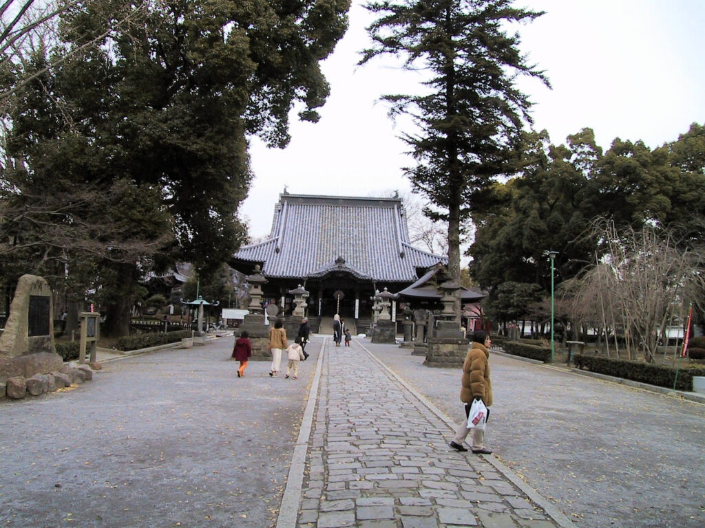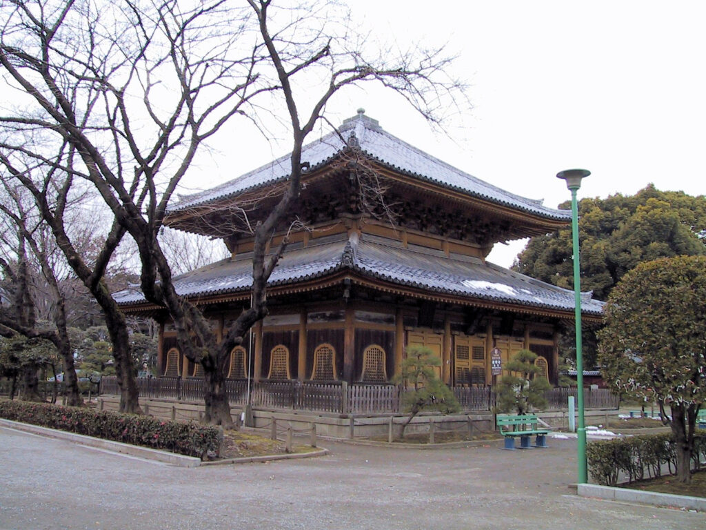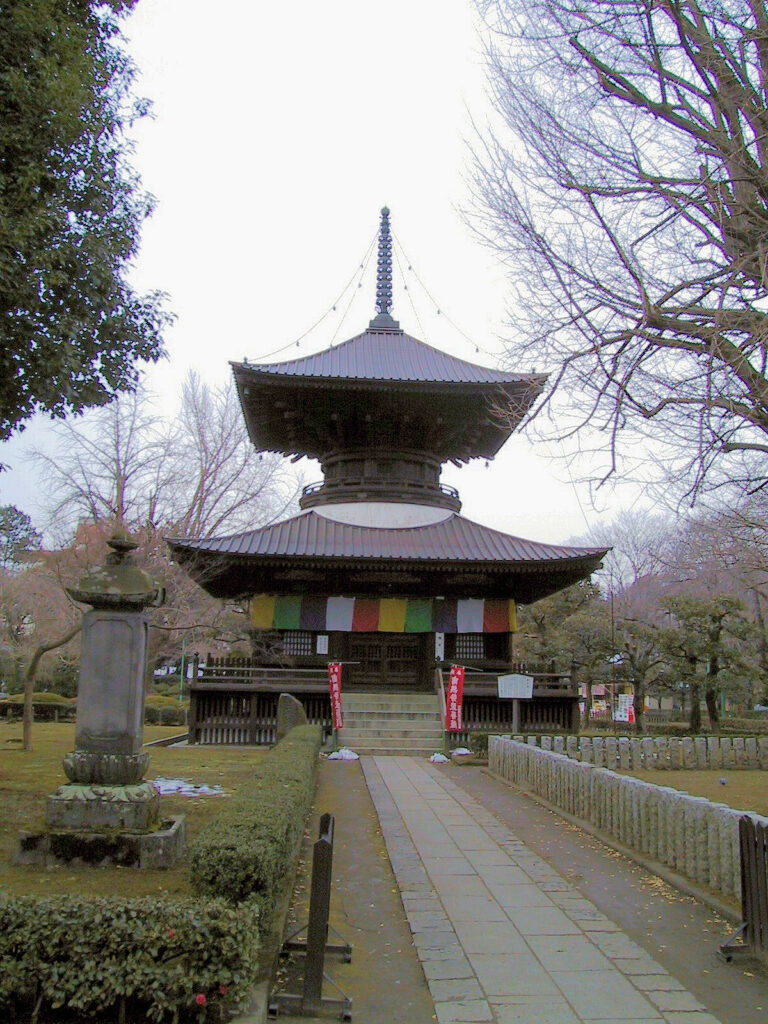 楼門をくぐり境内にはいると土塁の内側には大木がそびえ、正面には本堂(大御堂)が見えます。本堂に左側には多宝塔や経堂も見えますが、数日前の雪が境内に少し残り東京に比べると寒さを感じました。