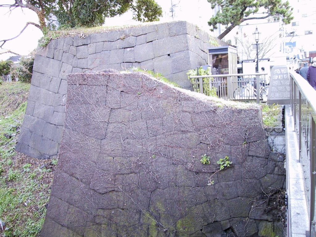 昨年に続き、今年(2000年)もFSIROの冷や奴さんと訪城しました。今回はまだ見ていない部分ということで北の丸とJR飯田橋駅の近くにある牛込見附を見ることにしました。飯田橋駅に着くとすぐそばに大きな石垣を発見しました。ここは三十六見附といわれる江戸城の外郭の一つでかつて桝形門になっていたようです。去年見た江戸城の石垣によく見た作りで(当たり前ですが)、すぐ近くには「阿波守」と書かれた石がありましたが、ここの石垣は蜂須賀家が担当したとのことですのでそれを示したものだったのでしょう。