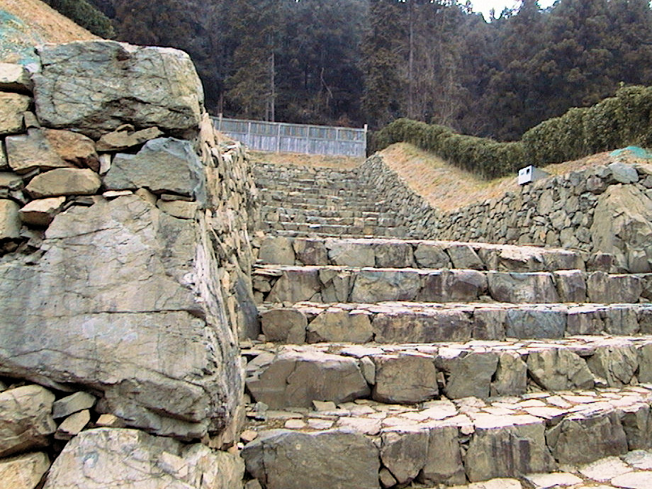 と書いたんですが、どうもこの大手道の石積みは櫓台ではないそうです(^^;) FSIROで寿太さんの書き込みがありましたが、「太田市の文化財関係者の見解は『極・最近のものだ』と言うこと」だそうです。ちょっとショックでしたが、確かによく考えてみれば、本丸裏手や南木戸の残存石垣に比べると石も小さいし、ちょっと違和感があります。まあ、これがもともとのものではないとしても、金山城自体の価値は変わりませんけどね。素晴らしいお城ですので、是非行ってみて下さい。