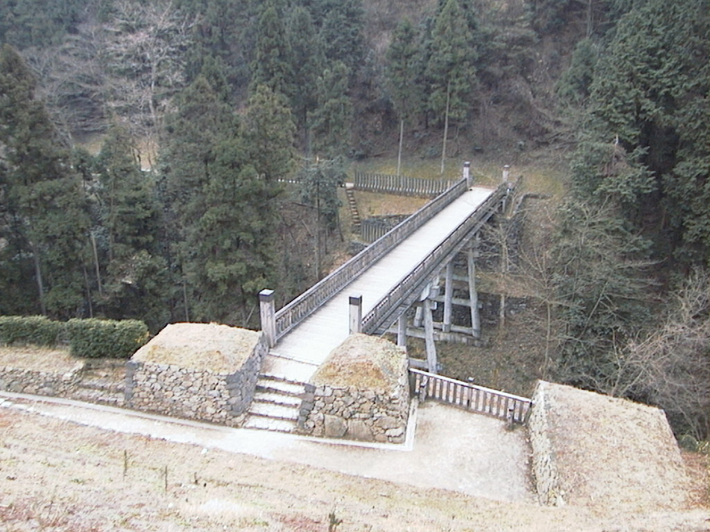 八王子城に昨年(99年)の1月に、NIFTY-SERVEの城郭フォーラム(FSIRO)のみなさんと訪城したところです。まずは大手道を進み、復元された曳き橋のところまで行きました。この曳き橋と橋の向こうの大手虎口の石垣や石段は、さすがに新しく復元されたものらしく初々しかったですが、なかなかの迫力で思わず何枚も写真を撮ってしまいました。(まあ氏照の時代にこんな立派なものがあったのかというと、どうなのかなとは思いますが...)