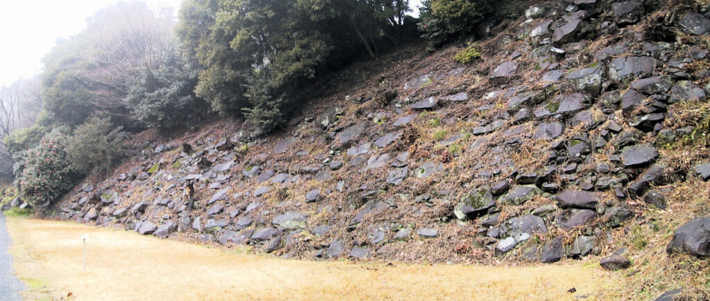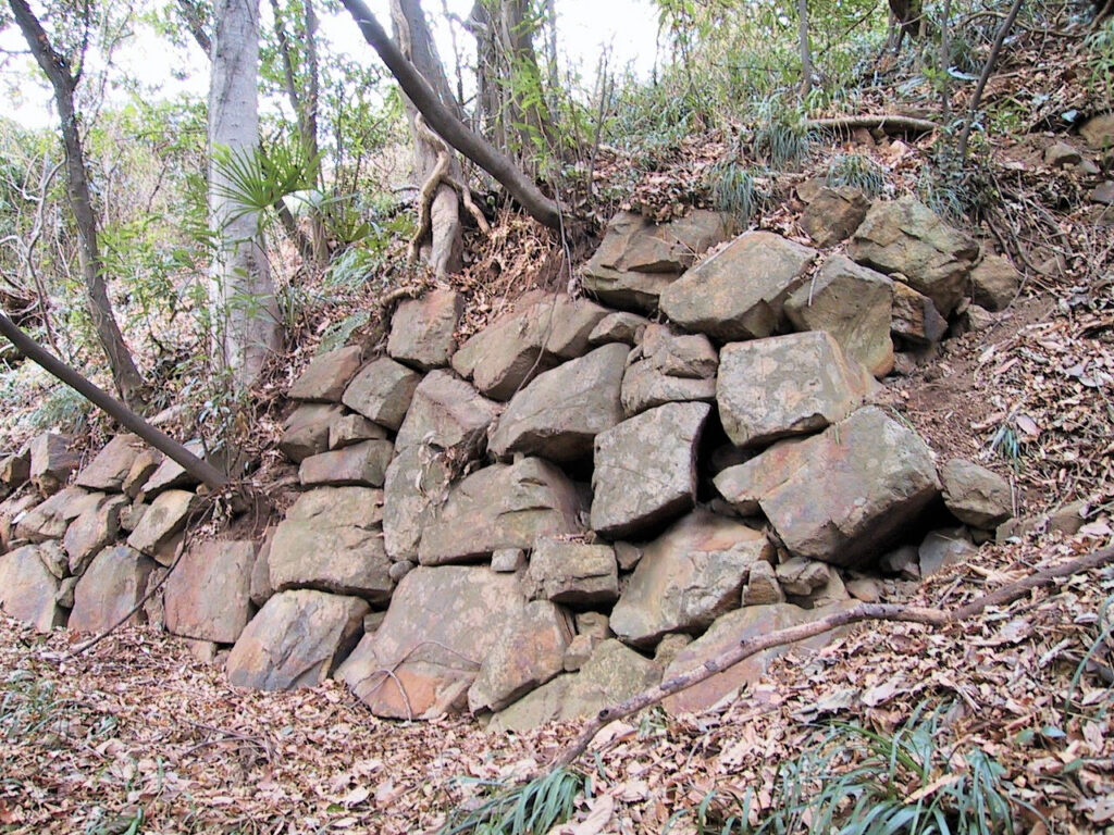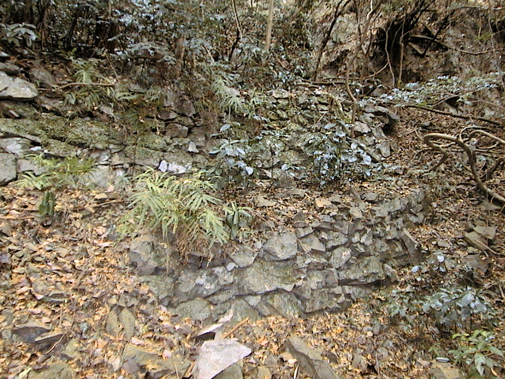 その後下っていって舗装道路に出たので、そのまま下るのかな?と思ったら、石垣でできた櫓台があるという話なので、車道沿いにまた上へ。丁度道路がカーブした辺りで櫓台発見! じゃ下におりてみようと冷や奴さんが言ったので、心の中では「えっ、やっぱり下りるの?」と一瞬思いましたが、下りて櫓台を見たらそんな思いは吹っ飛んでしまいました。