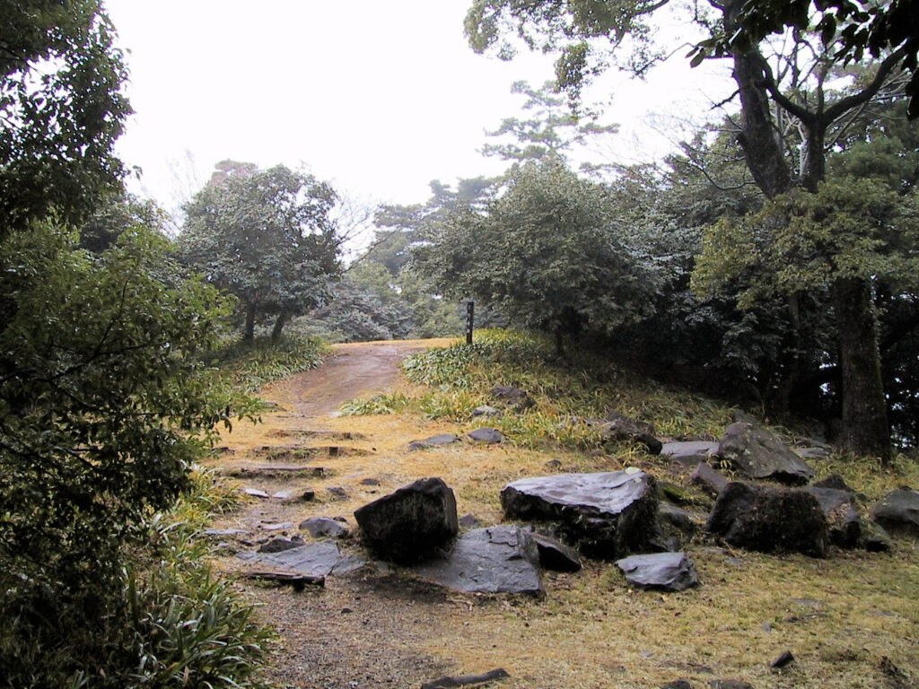 【主な遺構】本丸などの曲輪跡・日の池・月の池・櫓台・城門跡・石垣・空堀等