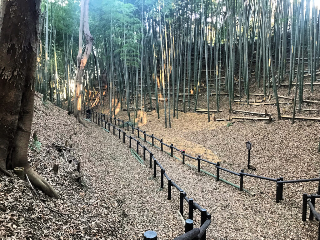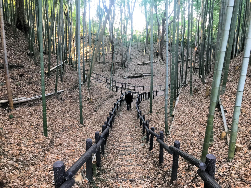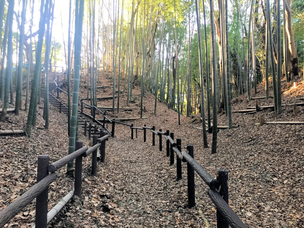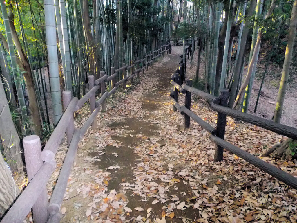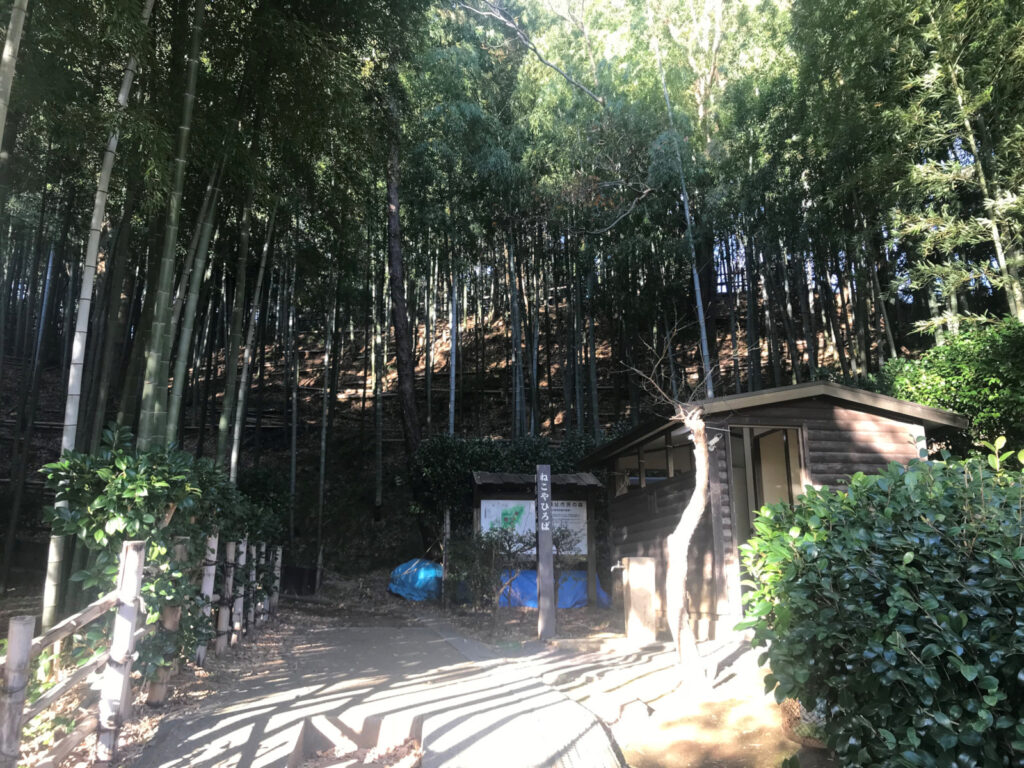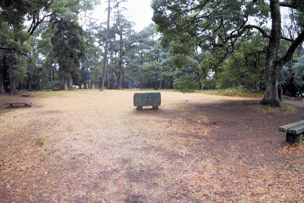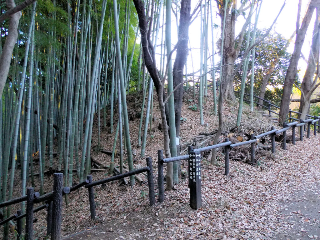 早速Kさんと合流し、電車を乗り継ぎ、途中の駅のコインロッカーに荷物を預け、いざ小机駅へ。駅から少し歩くとこんもりと緑に覆われた小山が見えてきました。これが小机城でした。そのまま進み住宅街の中の道を歩いて行くと「小机城址市民の森」という看板があちこちにあり、それに従って小山の方へ進むとまずは「根古屋広場」がありました。Kさんはここで一服するというので、私だけそのまま進み、突き当たりを左の方へ。
