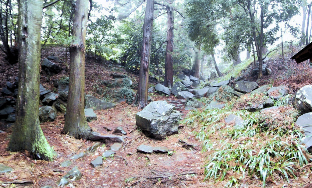 二の丸に戻ってみると、もやがかかってきていたので、あわてて南郭の横を通って入口の方へ戻りました。この途中にもかなり石垣が残っていました。