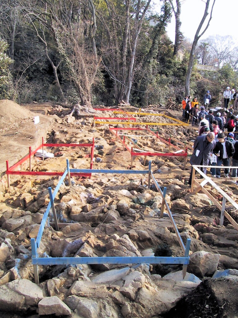 旅行最終日は、群馬県まで足をのばしました。この日は金山城の発掘説明会があるというので、浅草駅でNiftyのFSIRO(城郭フォーラム)の冷や奴さんと待ち合わせをし、東武伊勢崎線で太田市へと向かいました。太田に着くとタクシーで金山城まで行き、9時半頃には着きました。まず受付の方に行こうと登っていくと、途中でFSIROの旱雨さんに遭遇、三人で受付の所まで行き発掘説明会が始まるのを待ちました。