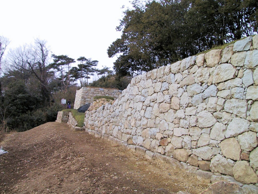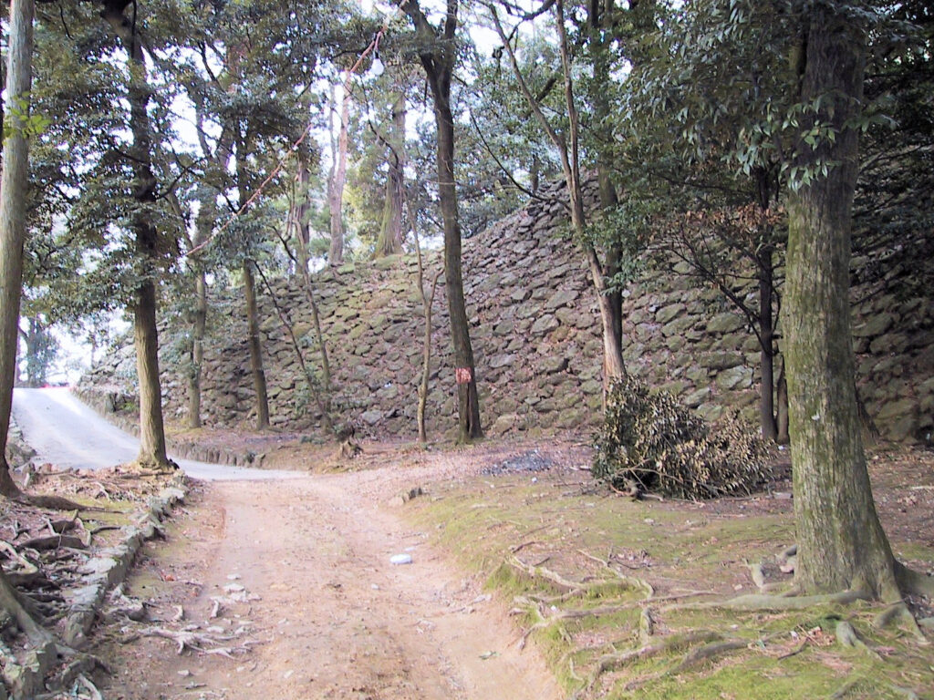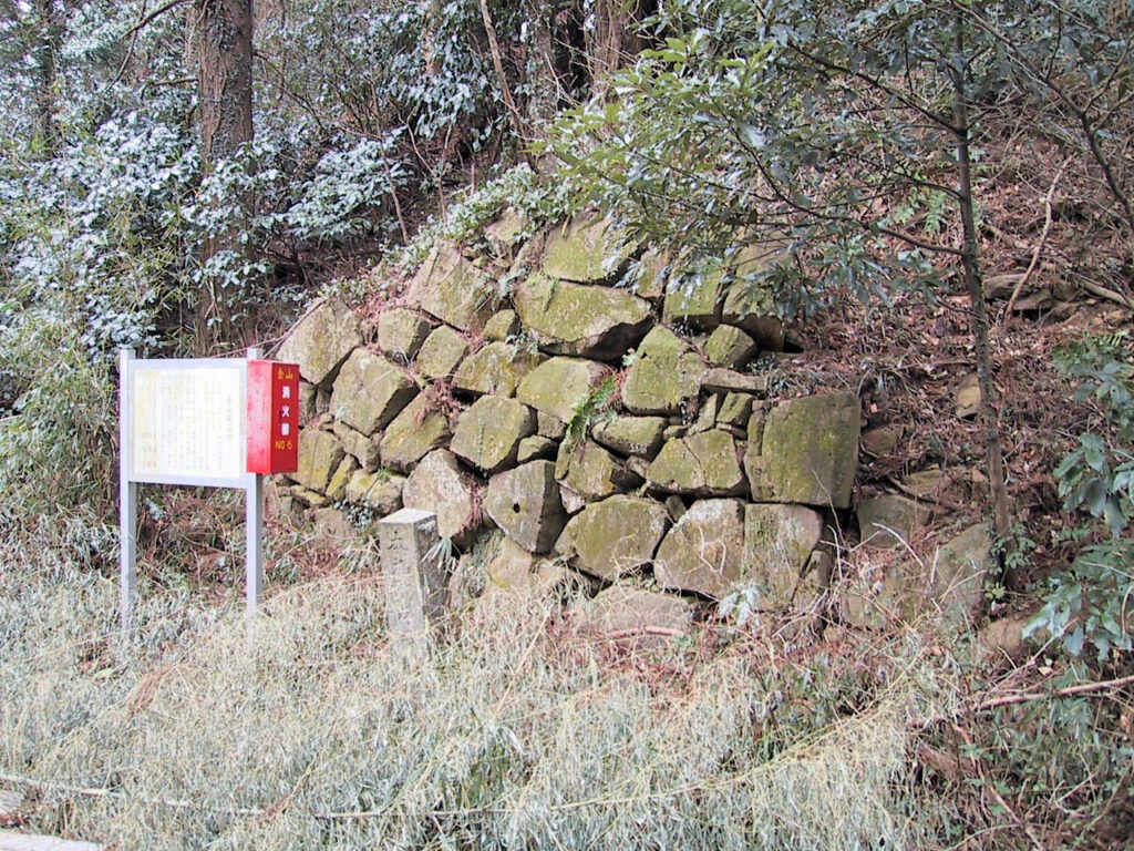 近づいてみると石垣でできた高さ2~3m、幅6~7mほどの立派な櫓台がありました。これを見たら、上の復元された新しい石垣が色あせて思えました(^^;) でも逆にこんな立派な櫓台があったのだから、あの石垣もまんざら嘘でもないのかなと思いました。この櫓台の下に道があったので、そのまま下っていくと金龍寺の近くに出ました。途中に標柱がありましたが、この道がもともとは大手道だったようです。