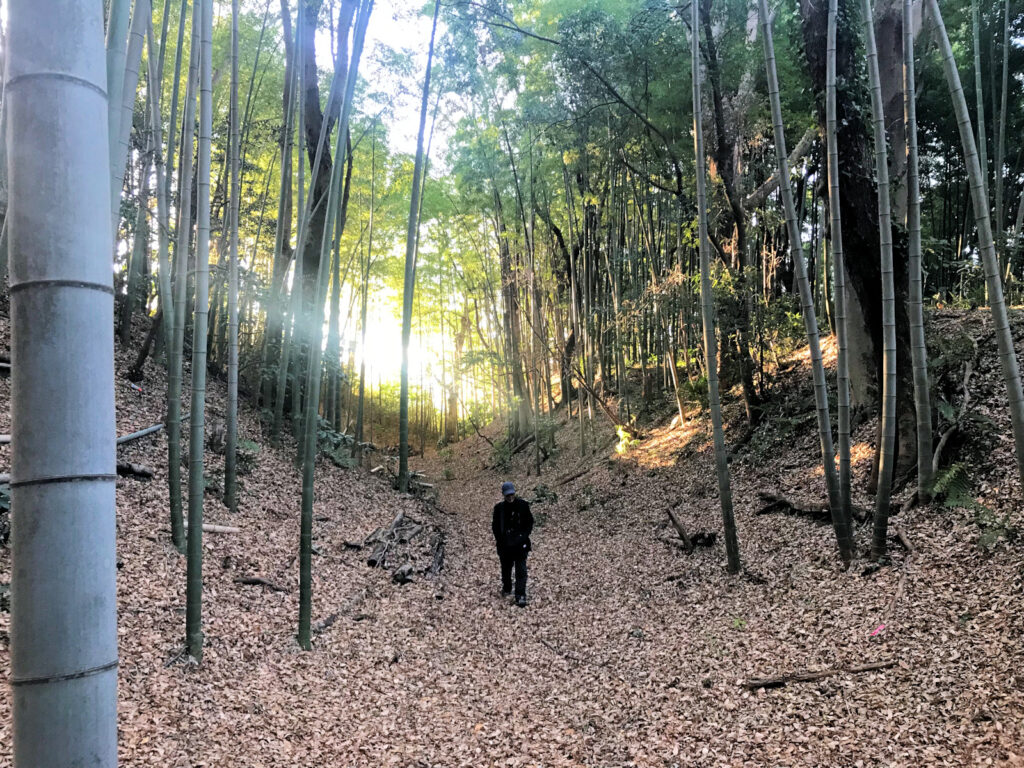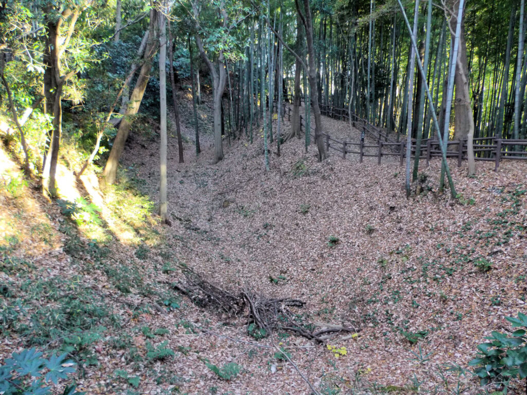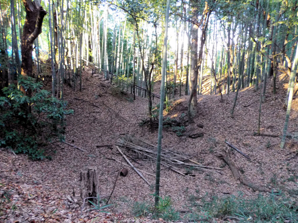 今度は本丸から東側の細長い郭へ進むとKさんと合流し、櫓台跡を見た後北側の空堀の方へと下りていきました。かなり深い壕で、十数mはありそうな規模でした。その壕がぐるっと本丸(西郭)・二の丸(東郭)の北側を取り囲んでいます。