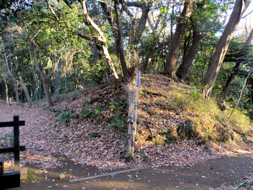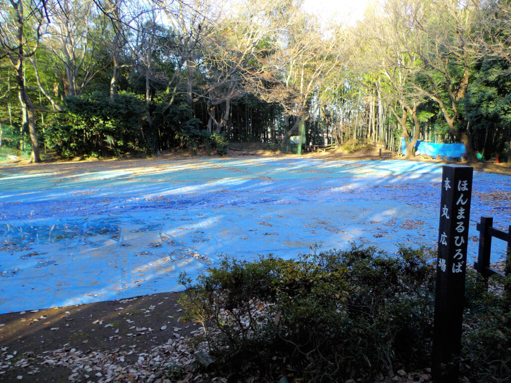 そして、二ノ郭へ入り畠山重忠像を眺めると、いよいよ本郭へと向かいます。本郭はきれいに整備されていて、土塁も堀もきれいに形を眺めることができます。本郭の小口のちょっと横には堀の方に少し突き出た出桝形土塁があり、本郭の小口の防御を固めています。