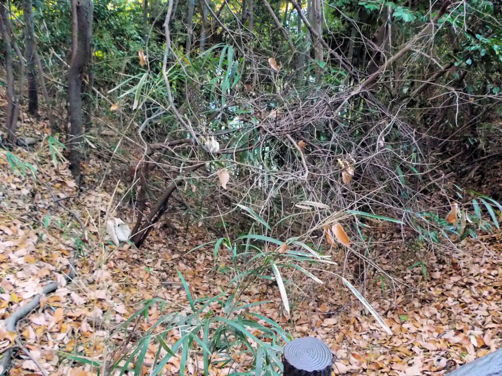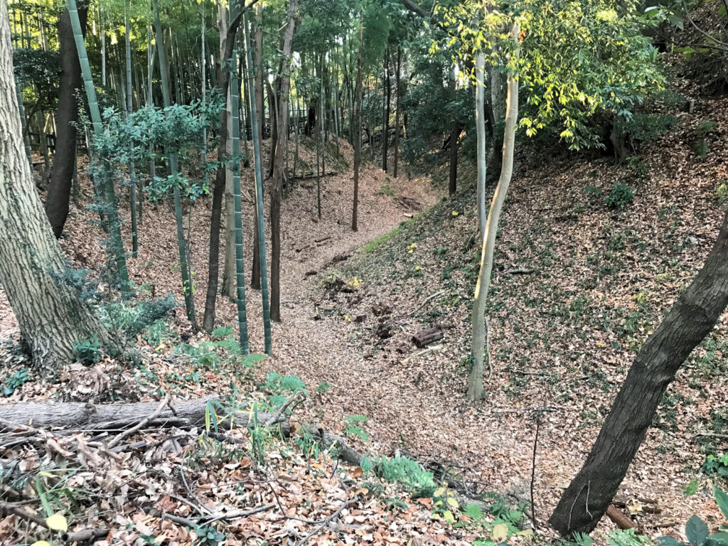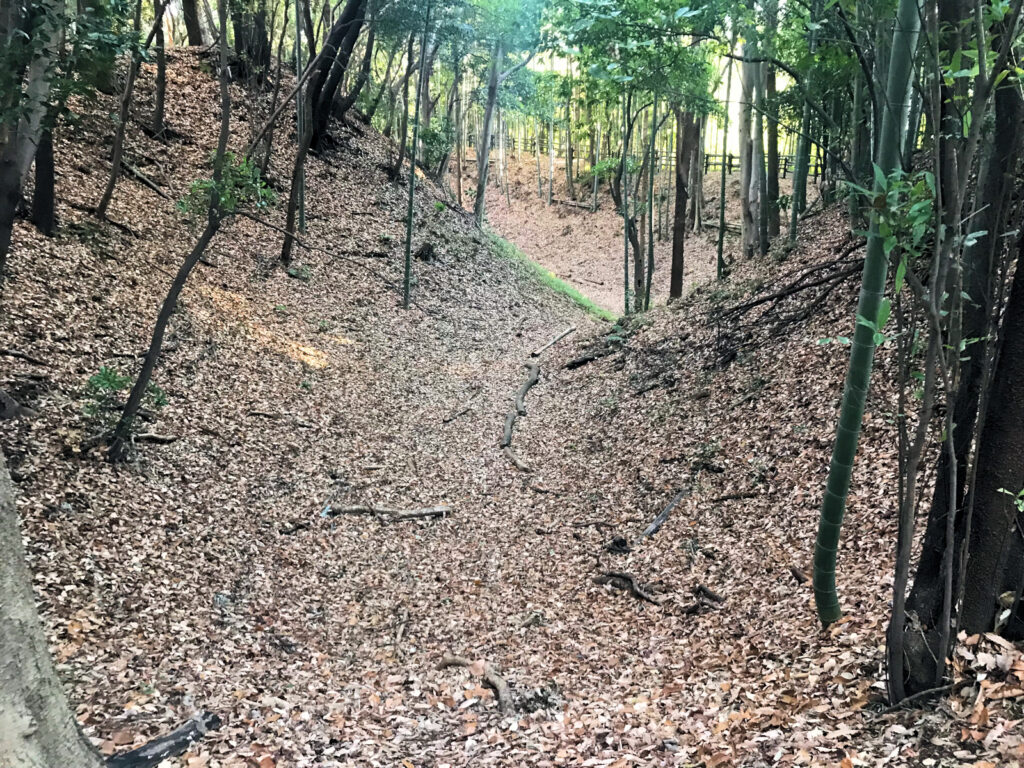 そしてそのまま堀沿いの土塁の上を歩き、第三京浜道路の方へと進むと、堀切?竪堀?のようなものが?