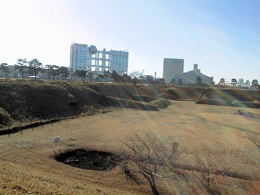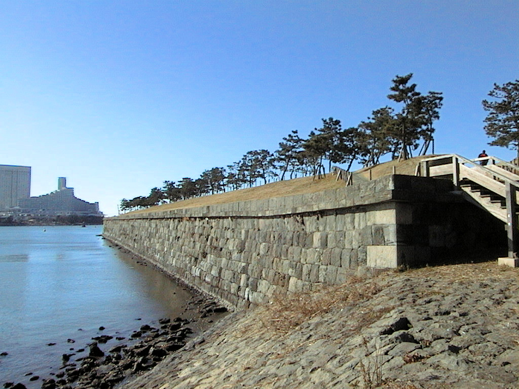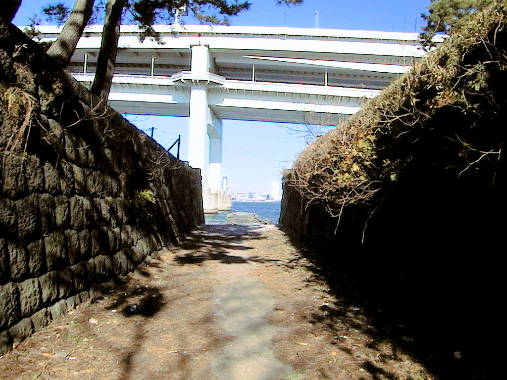 ここも昨年(99年)の1月に、FSIROのみなさんと行きました。まずゆりかもめでお台場海浜公園駅まで行き、あとは第三台場まで歩いてきました。第三台場に近づくと同じ時期に作られたためか、箱館の五稜郭の石垣と非常によく似ているような気がしました。左側の石垣の上に跳ね出しがある所などはそっくりです。また、この左側と右側の石垣に積み方は変えてあるそうです。