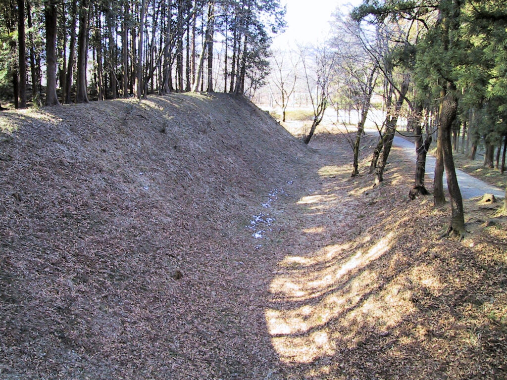 すると本丸(西郭)への土橋と大きな空堀が見えてきました。そして本丸(西郭)へと入ると虎口に大きな土塁がありぐるっと取り囲んでいます。そのまままっすぐ進み本丸(西郭)の反対側に行ってみると、そちらにも大きな空堀がありました。